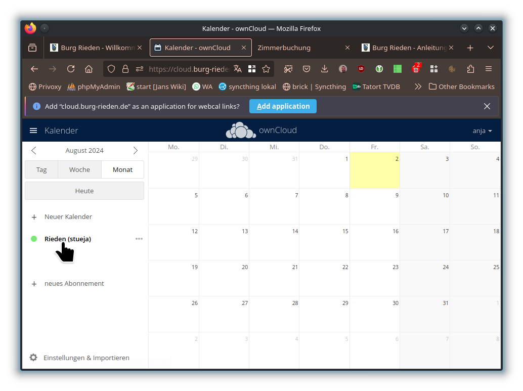 Termine im gemeinsam verwendeten Kalender siehst Du, wenn vor “Rieden (stueja)” ein farbiger Punkt zu sehen ist. Sollte kein farbiger Punkt zu sehen sein, klicke einmal auf “Rieden (stueja)”.
